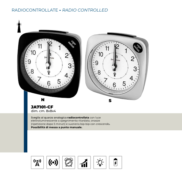 JM Tipo Sveglia da comodino,Movimento Quarzo, Radiocontrollata, Movimento continuo silenziosoCassa ABSQuadrante Analogico con luceCaratteristiche Luce elettroluminescente a spegnimento ritardato, Suoneria...