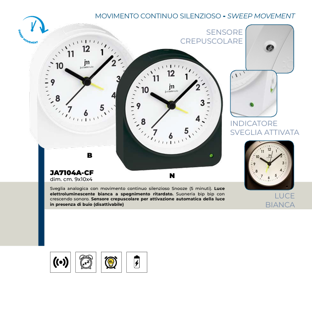 JM Tipo Sveglia da comodinoMovimento Quarzo, movimento continuo silenziosoCassa ABSQuadrante Analogico con luceCaratteristiche Luce, Snooze (ripetizione della suoneria dopo 4...