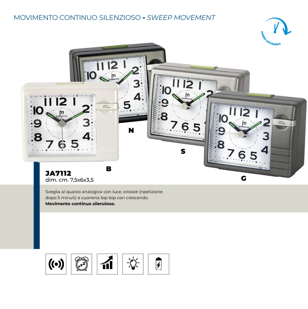 JM Tipo Sveglia da comodino Movimento Quarzo, movimento continuo silenzioso Cassa ABSQuadrante Analogico Caratteristiche Luce, Suoneria bip-bip con crescendo, Snooze...