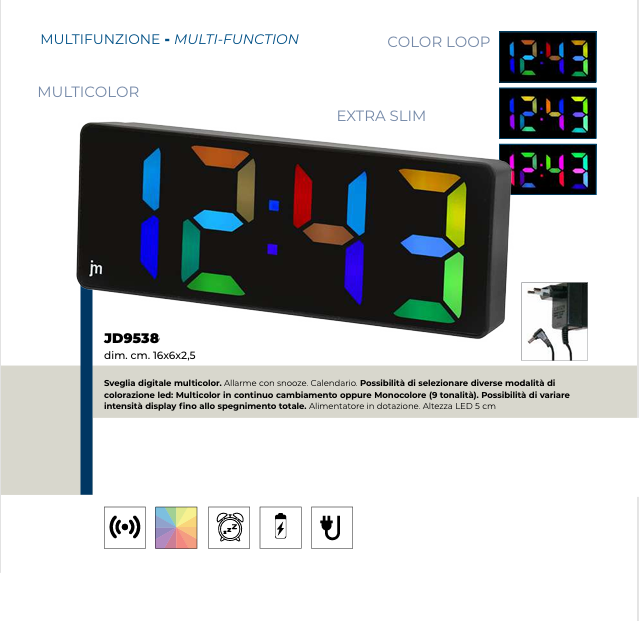 JM Sveglia digitale, con trasformatore. Movimento Quarzo Cassa ABS Quadrante Digitale Caratteristiche Stazione barometrica radiocontrollata...