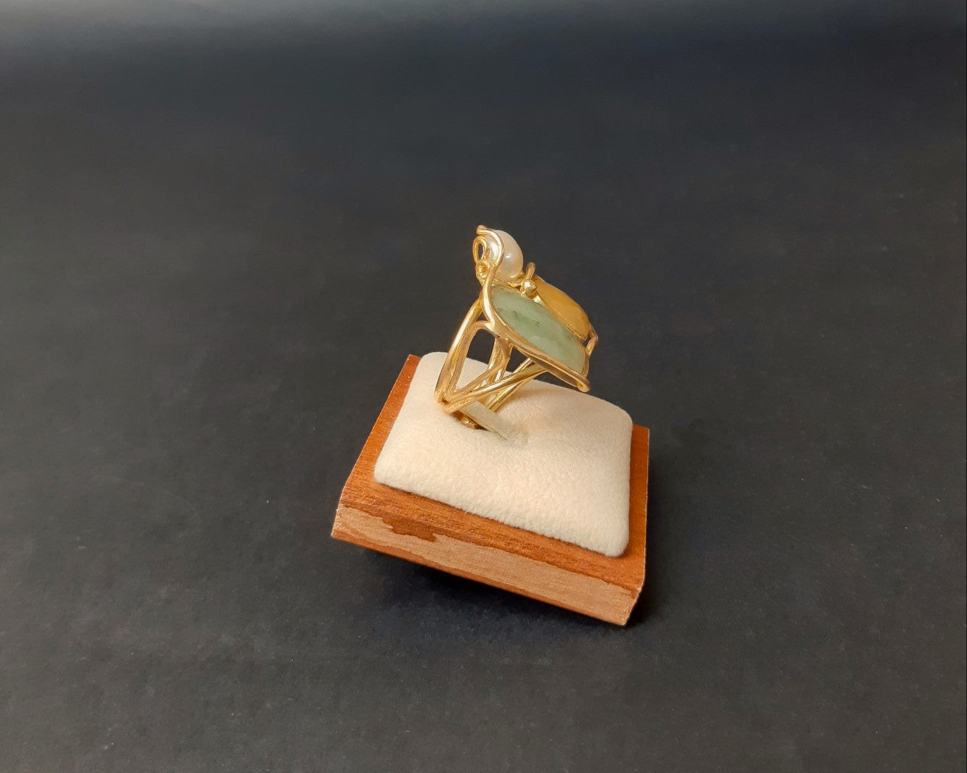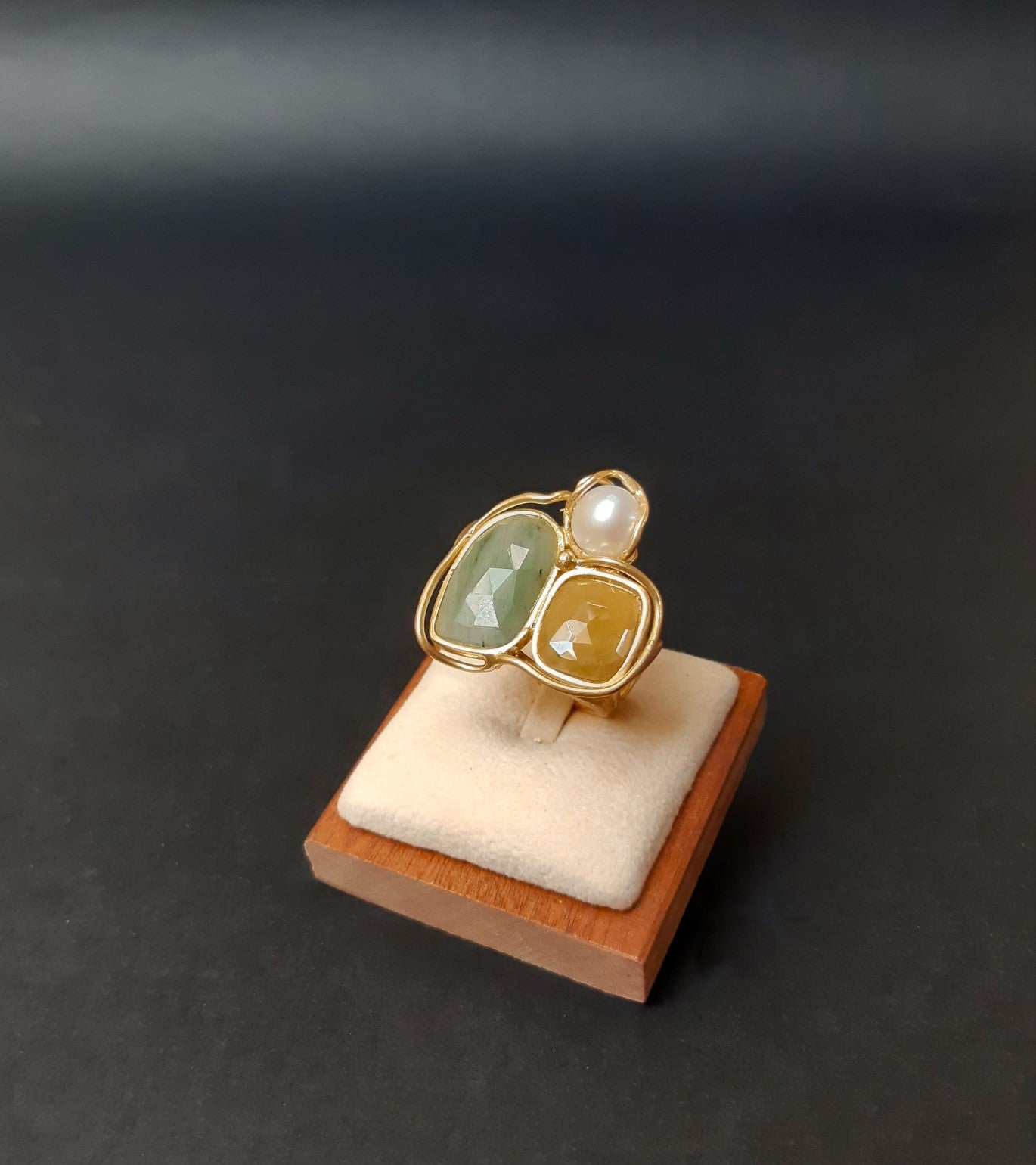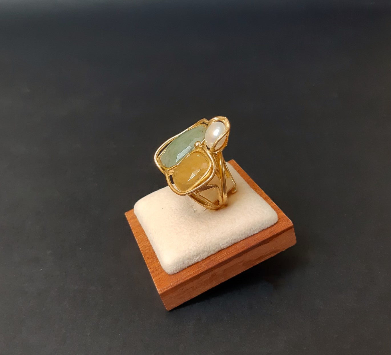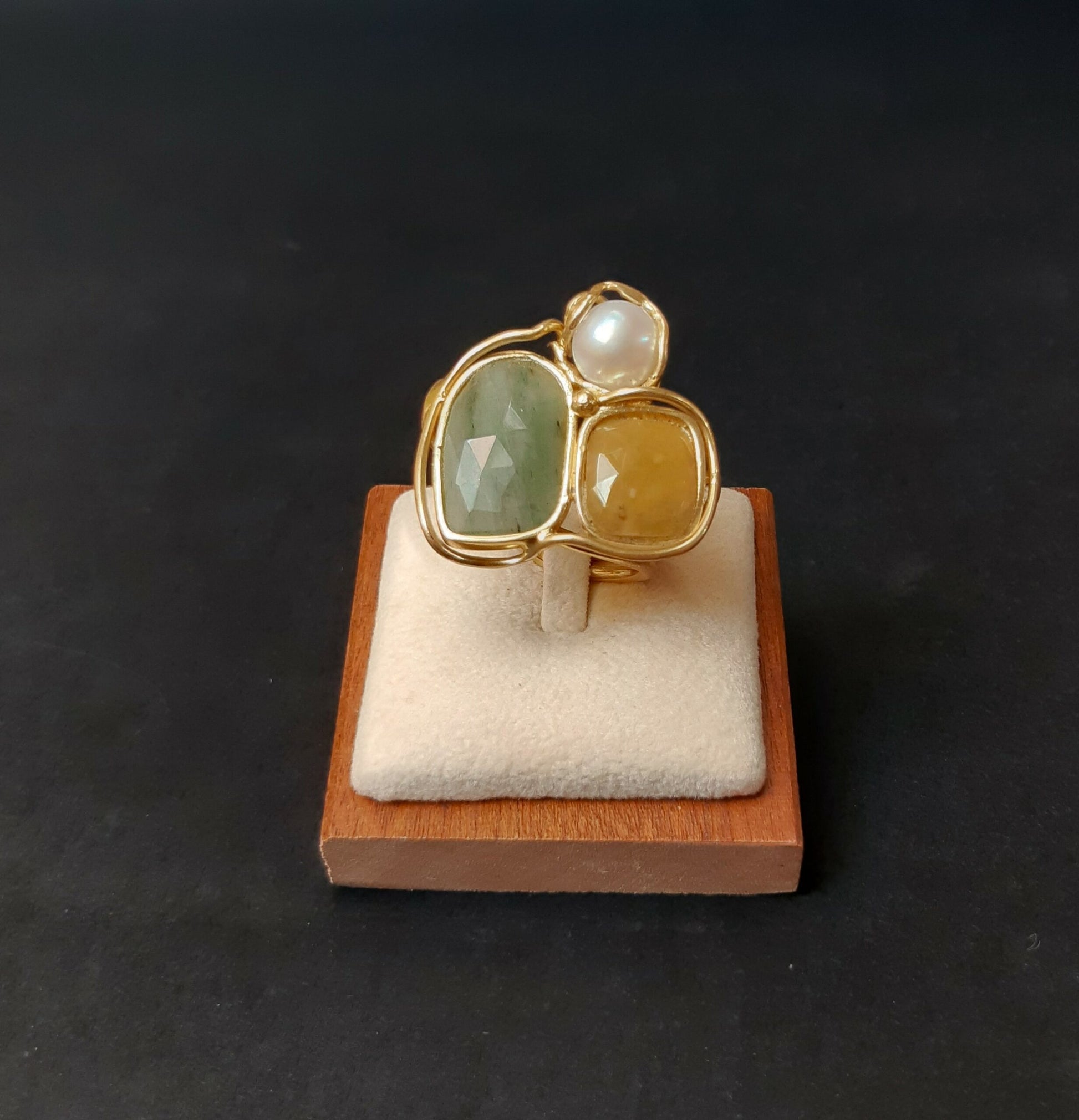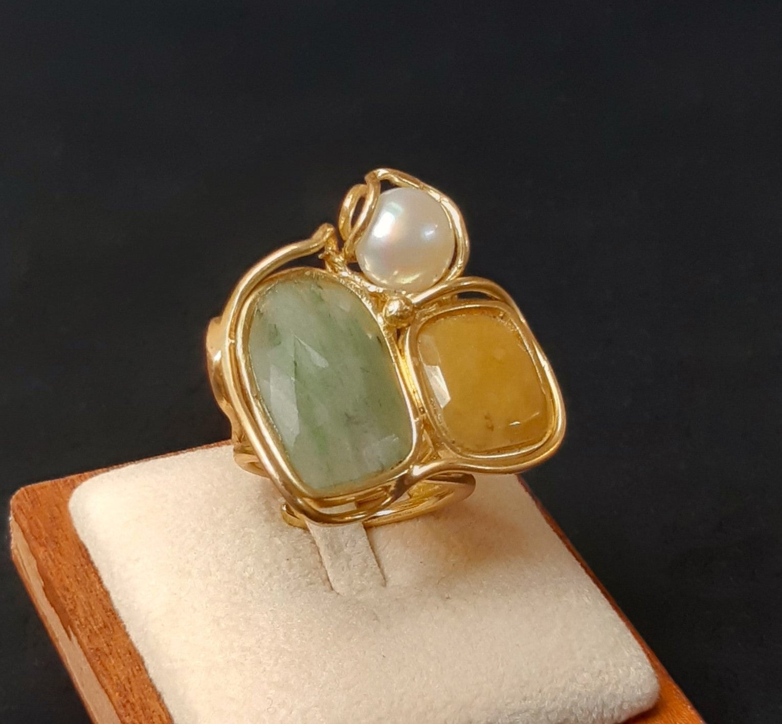 COLLEZIONE ELEMENTI Tipo Anello in Argento 925 placcato Oro, con pietre Naturali Pietra Perla (di acqua dolce), associata all'elemento Acqua, la Perla rappresenta il principio Yin, ossia il simbolo essenziale della femminilità e della fertilità; l’ostrica stessa infatti, come conchiglia, viene associata al concetto di nascita, sessualità e vita Grazie al legame delle perle con nozioni di purezza e dolcezza, fin dai tempi antichi, erano un ottimo dono di nozze. Secondo l'antica tradizione indù, è comune l'uso delle perle nei matrimoni come simbolo di purezza. Corindone, associato all'elemento Terra, ha la capacità di risvegliare il potenziale interiore. Dirige tutti i pensieri e i desideri del proprietario nella giusta direzione, ma solo se fa uno sforzo e mostra interesse. La pietra ha una funzione che allontana le paure. Prima di avviare un'attività importante, tutti si sentono insicuri. Il corindone distrugge completamente le barriere al successo. Finitura Oro giallo Misura 16 Regolabile Peso gr 12,75 Creazione Artigianale Made in Italy