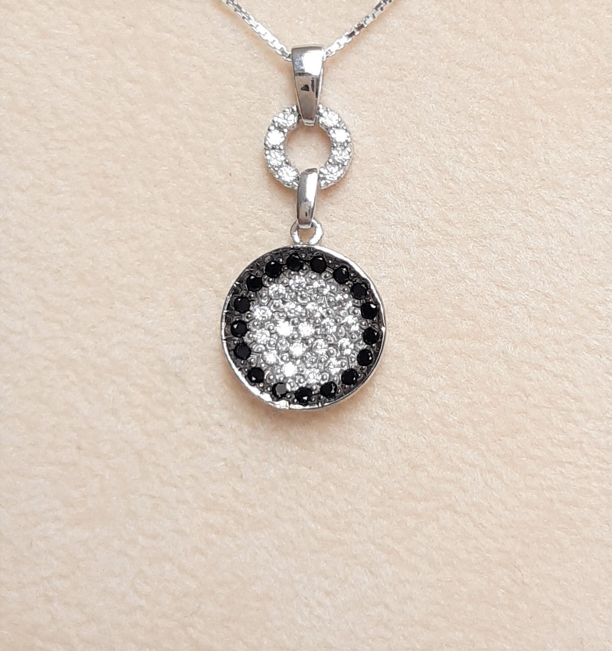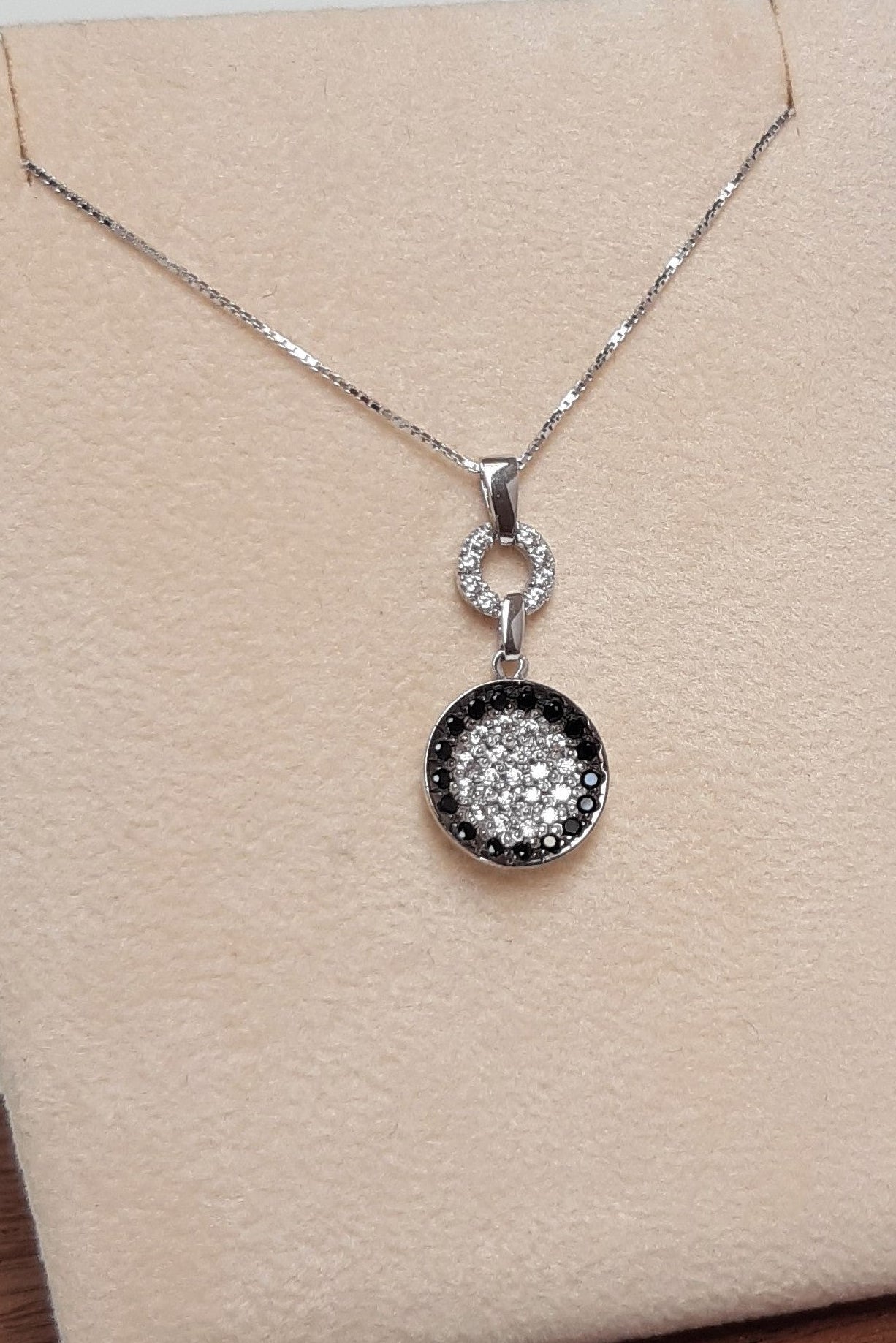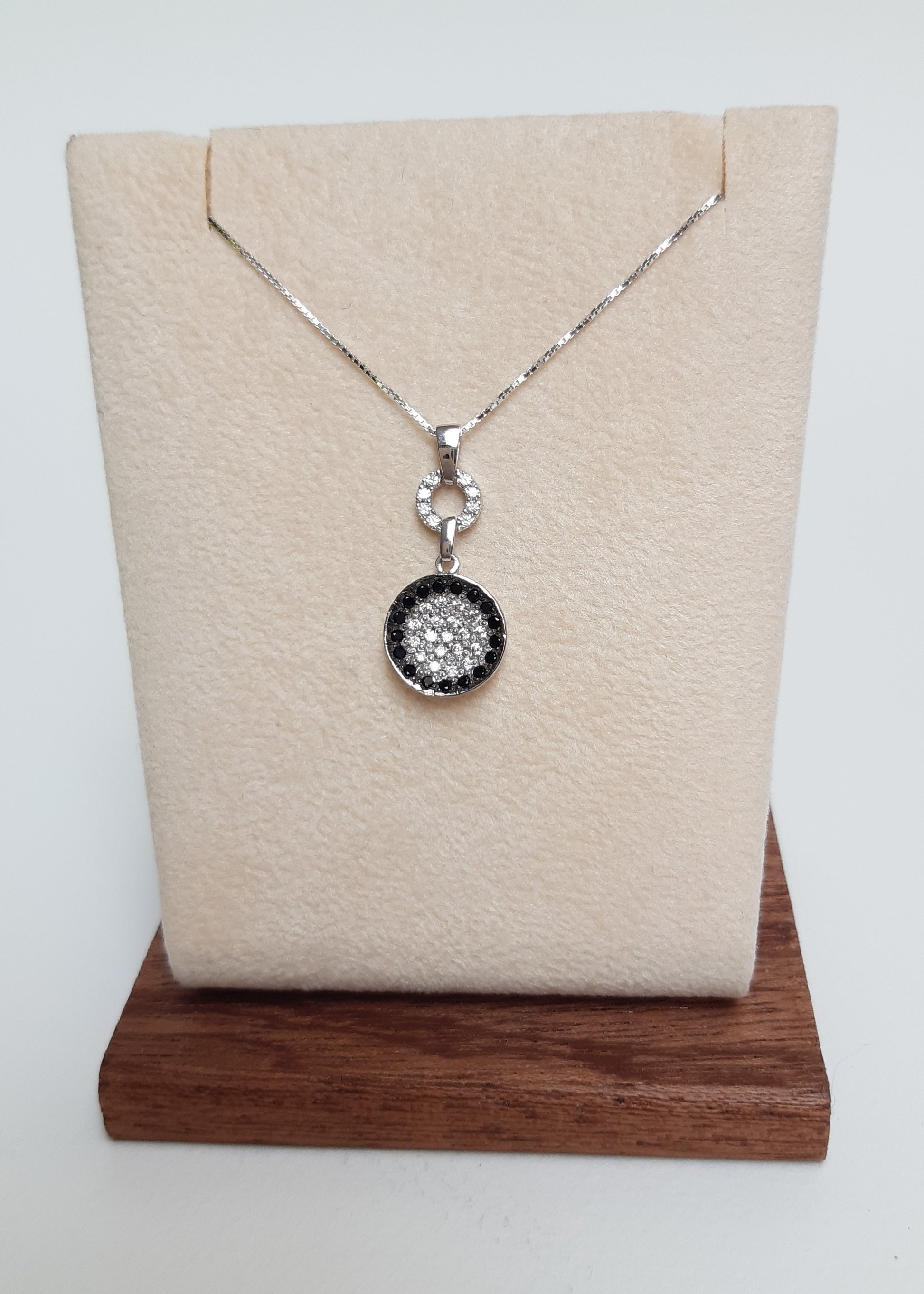 Materiale Oro 18kt Caratteristiche Catenina in Oro bianco, maglia veneta, con ciondolo in Oro bianco con Zirconie Spinelli neri Grammi gr 3,35 Lunghezza cm 42,00 Lunghezza ciondolo cm 2,5