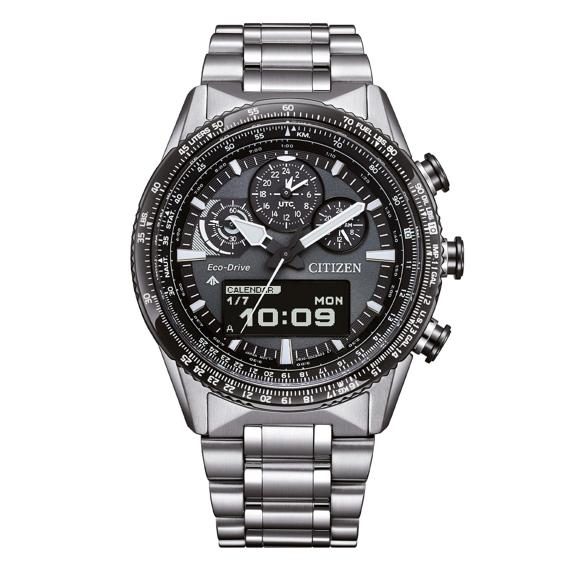 Funzione Multifunzione Tipo di movimento Eco-Drive (a carica luce infinita) Riserva di carica fino a 3 anni e indicatore energia generata Tipo di vetro Zaffiro Caratteristiche Cassa in acciaio con regolo calcolatore di tipo aereonautico, bracciale in acciaio Funzioni World Time, cronografo a 1/100 di sec fino a 24 ore, timer, allarme, calendario perpetuo Tipo di quadrante Analogico/Digitale Colore quadrante Nero Materiale della cassa Acciaio Tipo di cinturino Bracciale in Acciaio Diametro della cassa mm 43 Resistenza all'acqua WR 20 bar Peso gr. 174