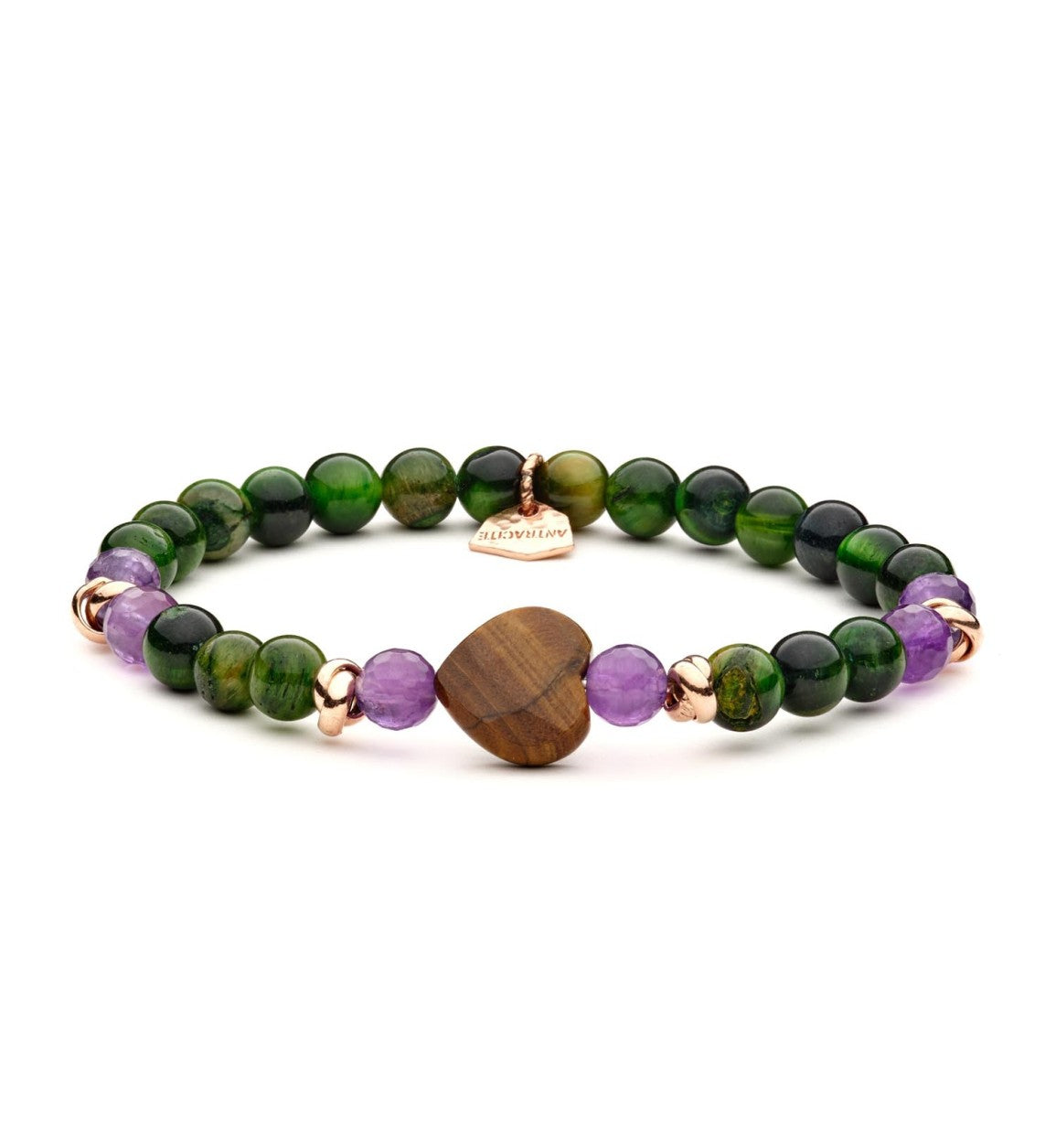 Bracciale in Argento rosato 925 riciclato e anallergico. Pietre dure naturali da 6mm Pietre Cuore: Occhio di Tigre marrone. Bracciale: Occhio di Tigre verde, Ametista - Argento Rosato 925% Dimensione Pietre: 6 mm Lunghezza del gioiello 18 cm.