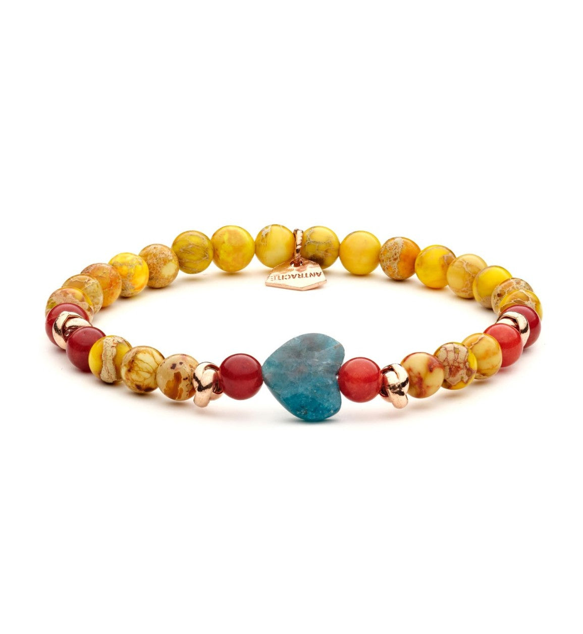 Bracciale in Argento rosato 925 riciclato e anallergico. Pietre dure naturali da 6mm Pietre Cuore: Apatite. Bracciale: Diaspro giallo, Giada rossa - Argento Rosato 925% Dimensione Pietre: 6 mm Lunghezza del gioiello 18 cm.