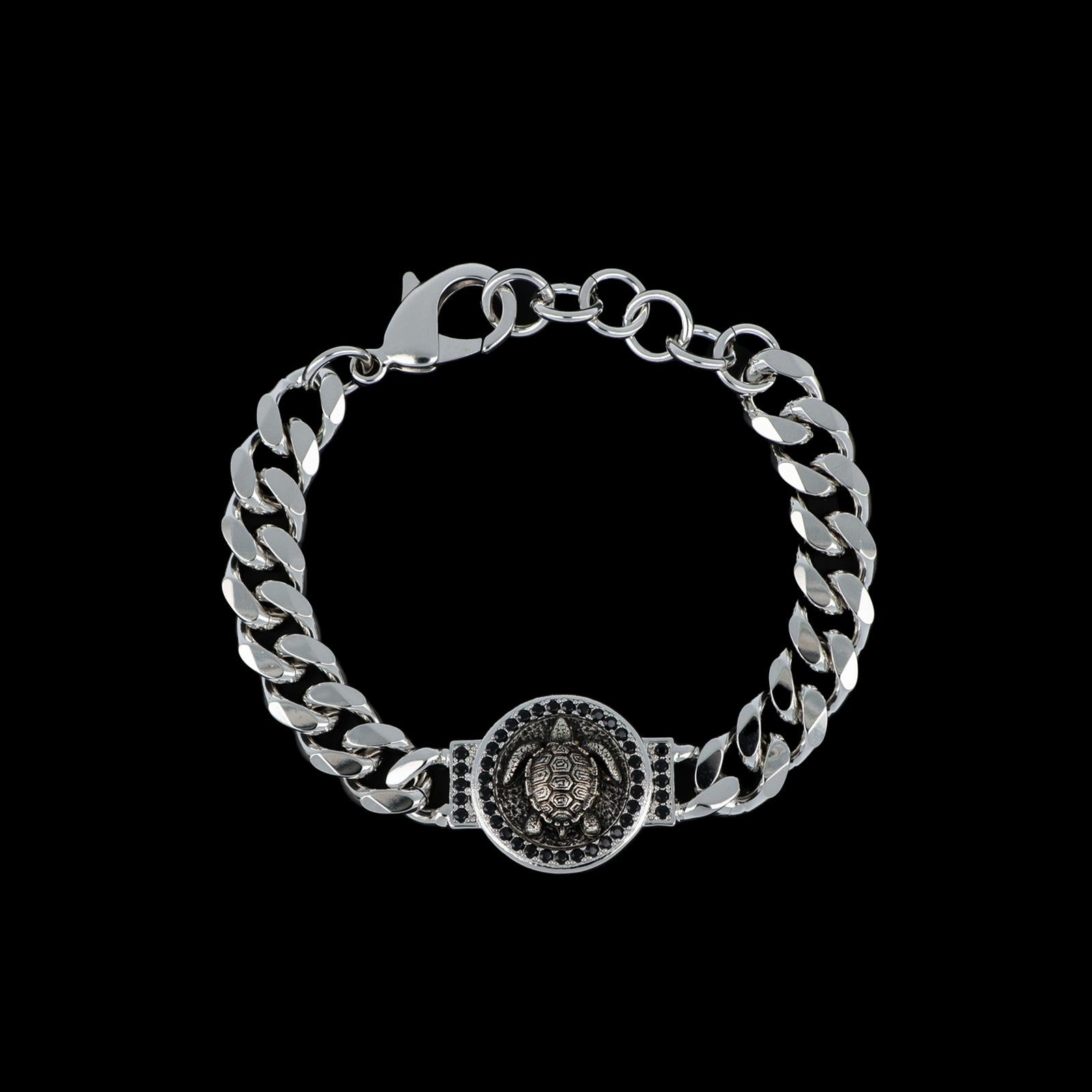 BLIND lab Tipo Bracciale maglia groumetta con centrale con Zirconi neri raffigurante una Tartaruga Simbolo di Immortalità, regalare una tartaruga è un augurio di saggezza calma e pazienza Finitura Argento lucido Caratteristiche Resistente ai graffi, Ipoallergenico Misura cm 18,5+4 Designed e Made in Italy Realizzato a mano